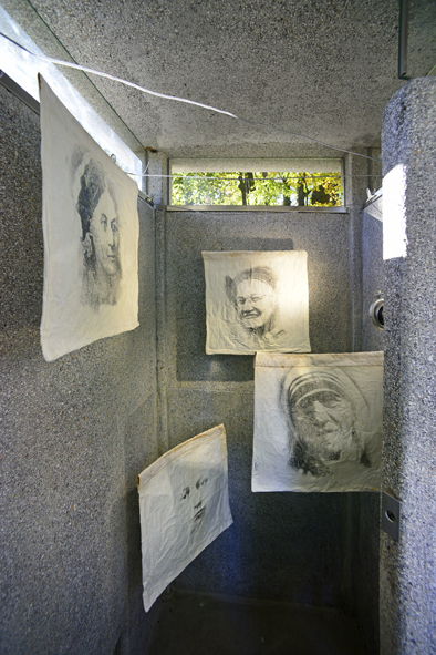 Het verhaal over Veronica die het aangezicht van Jezus droogt, waarbij een afdruk van zijn gezicht op het doek achterblijft spreekt mij aan omdat mijn werk als kunstenaar meestal te maken heeft met gezichten. Naar aanleiding van een gesprek met een gedetineerde was zijn idee om niet de nadruk te leggen op het lijden maar op de trooster: Veronica. Vrouwen die hem troost bieden in de gevangenis, zoals een tante die hem bezoekt, of een bewaakster die even lacht of zwaait. Een woord van troost. We hebben gekozen voor bekende en onbekende vrouwen en ze afgedrukt op afgedankte lakens en slopen uit de gevangenis, zoals o.a.: Florence Nightingale, Majoor Bosshardt, moeder Teresa, Rosa Parks,